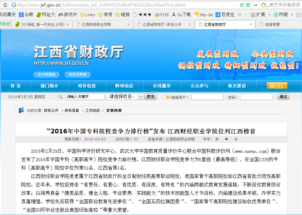 3月3日,江西省財政廳網站報道2016年中國專科院校競爭力排行榜排名情況,我校在排行榜上位列全國第51名,江西省第1名。