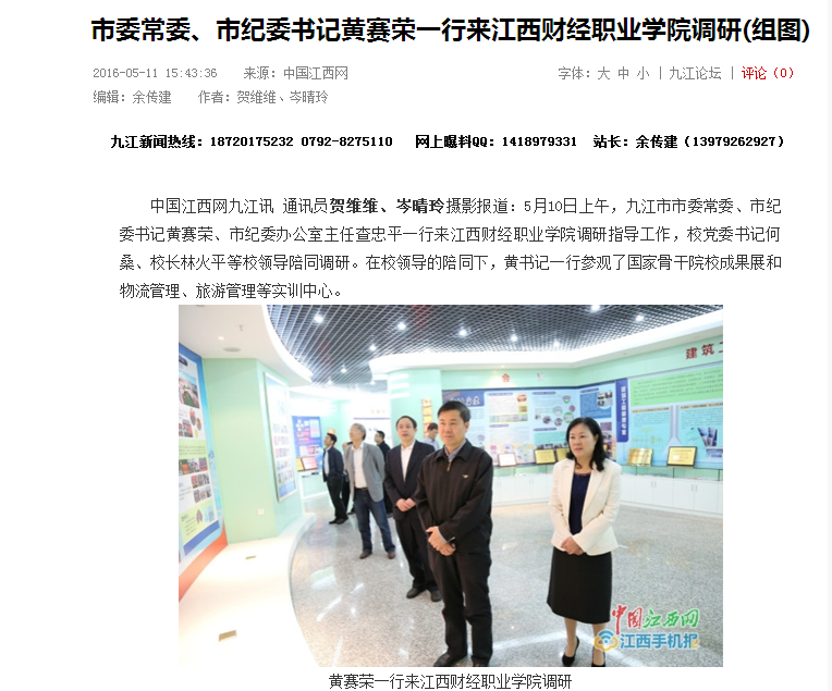 5月11日,中國江西網報道市委常委、市紀委書記黃賽榮一行來我校調研。