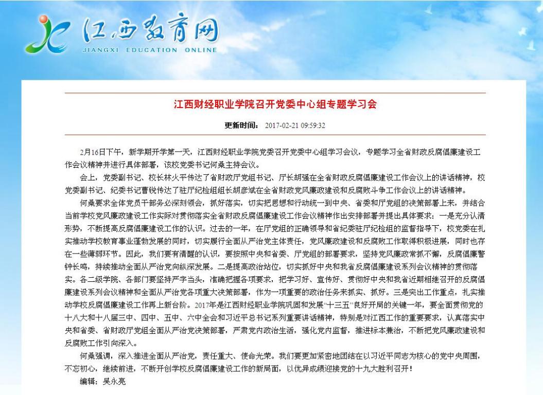 2017年2月21日,江西教育網報道我校黨委中心組召開黨風廉政建設專題學習會情況。