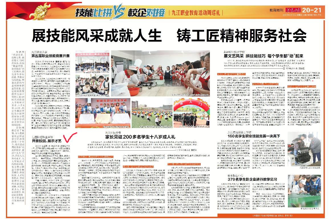 5月11日,潯陽晚報教育周刊報道職業教育活動周情況,介紹了我校開展豐富多彩的職教宣傳活動。全文如下: