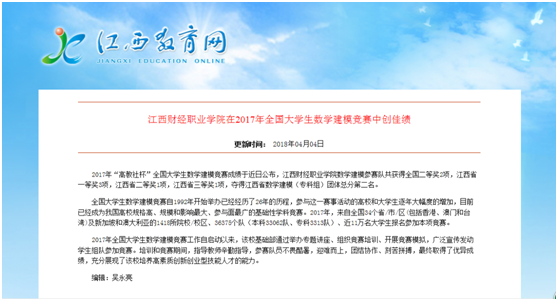 4月4日,江西教育網報道了我校在2017年全國大學生數學建模競賽中創佳績一事。