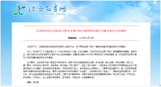 4月10日,江西教育網(wǎng)報(bào)道了我校學(xué)習(xí)貫徹 全國“兩會(huì)”精神和加強(qiáng)作風(fēng)建設(shè)有關(guān)文件精神。