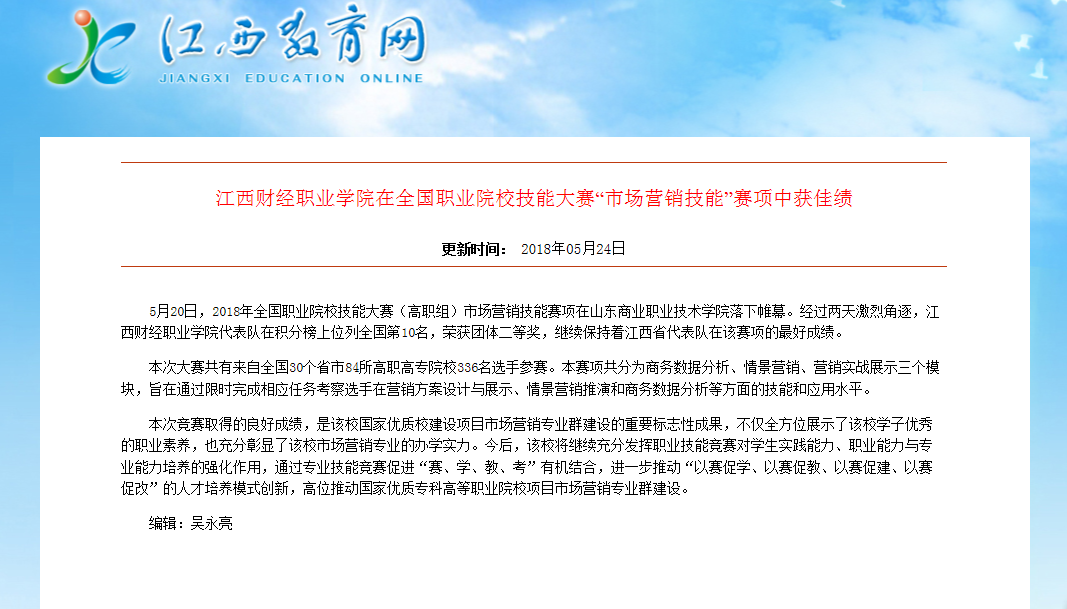 5月24日,江西教育網報道我校在全國職業院校技能大賽“市場營銷技能”賽項中獲佳績。