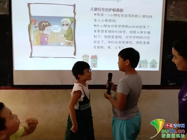 安全自護課堂上,孩子們在隊員指導下表演演情景劇,維妙維肖!(中國青年網通訊員 陳義楨 提供)