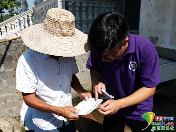 為了孩子的安全,隊員們頂著烈日走村串戶發送自制的“兒童安全自護常識”手冊,并耐心解讀。(中國青年網通訊員 詹曉童 提供)