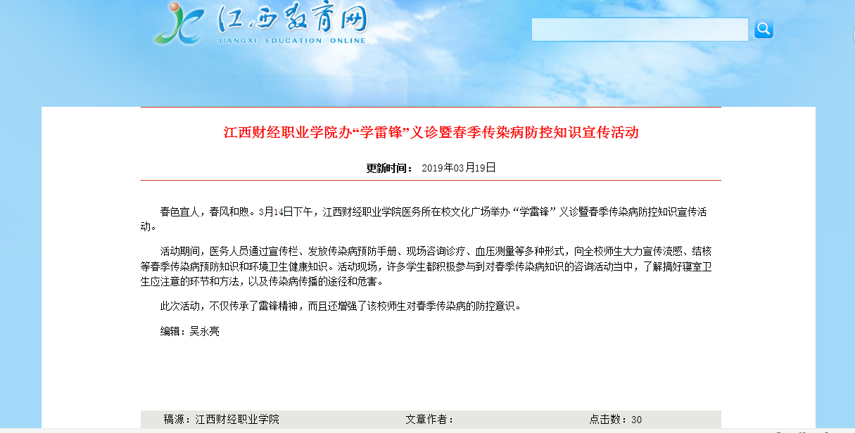 3月19日,江西教育網報道我校舉辦“學雷鋒”義診暨春季傳染病防控知識宣傳活動。