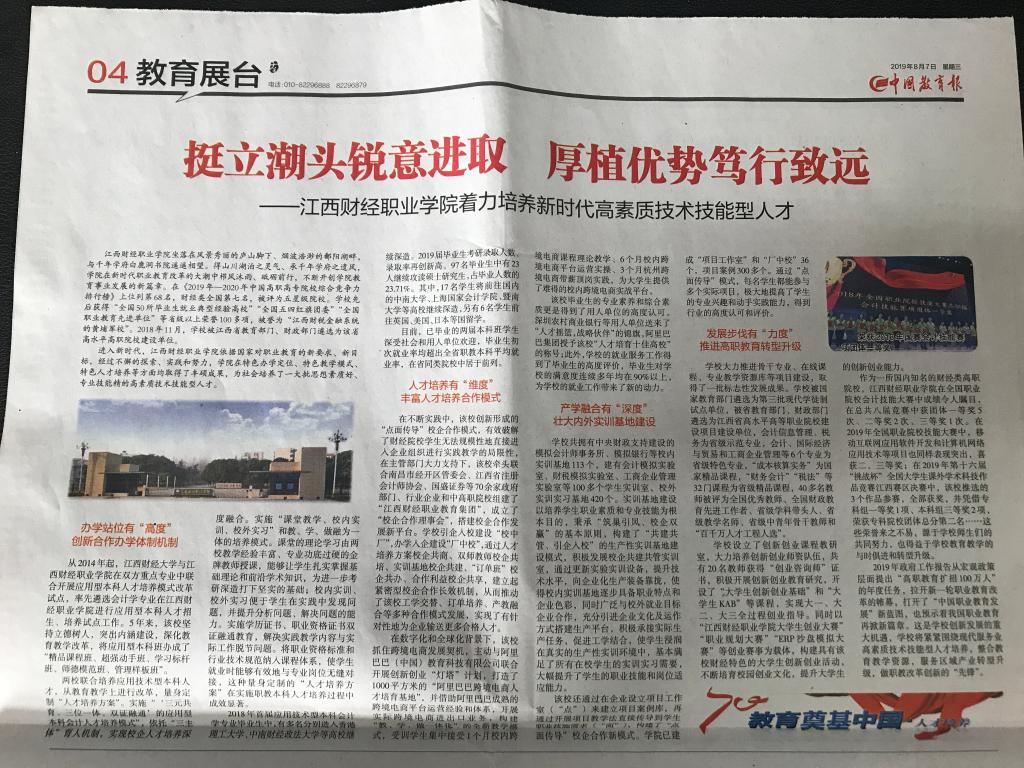 8月7日,《中國教育報》刊登我校在深化教育教學改革,創新人才模式中取得的顯著成果。