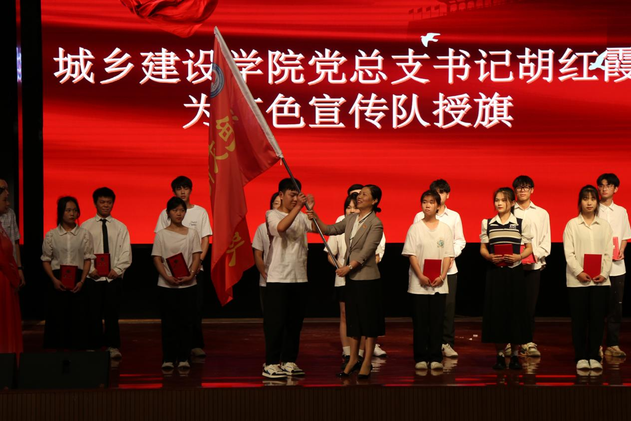 第二項議程為城鄉建設學院黨總支書記胡紅霞為江西財經職業學院城鄉建設學院紅色文化宣傳隊授予隊旗;
