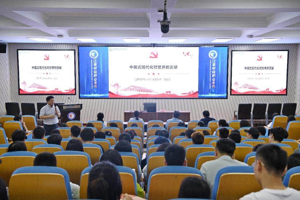 為深入學習貫徹習近平新時代中國特色社會主義思想和黨的二十大精神,在中國式現代化偉大實踐中英勇擔當、矢志奮斗,6月8日下午,校黨委書記劉彪文在七樓報告廳以《中國式現代化對世界的貢獻》為題講授了一堂生動的思政課。部分中層干部、輔導員和部分職教本科班學生300余人參加了學習。