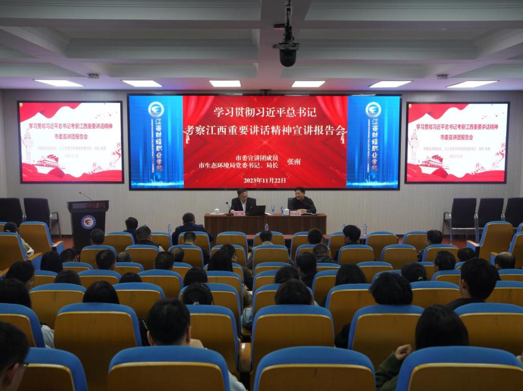 11月22日,學(xué)習(xí)貫徹習(xí)近平總書(shū)記考察江西重要講話(huà)精神市委宣講團(tuán)在我校宣講,市委宣講團(tuán)成員、市生態(tài)環(huán)境局黨委書(shū)記、局長(zhǎng)張南作宣講報(bào)告。校黨委書(shū)記劉彪文主持報(bào)告會(huì)。全體在家校領(lǐng)導(dǎo)、中層以上干部、教師黨員以及學(xué)生代表300余人參會(huì)。