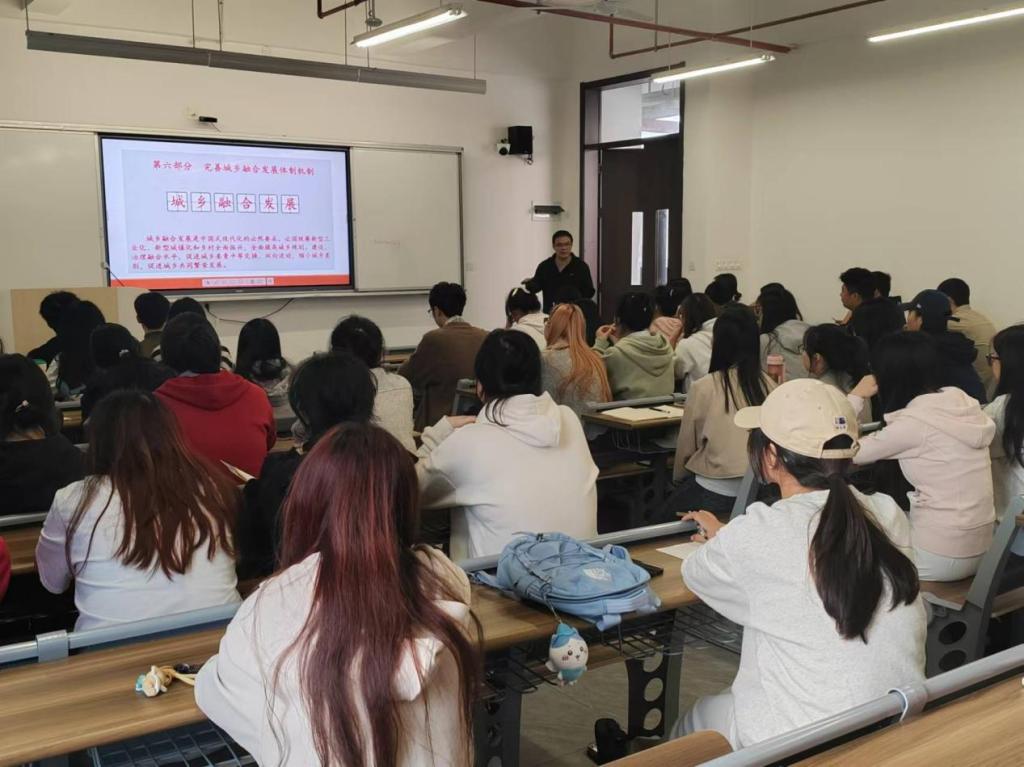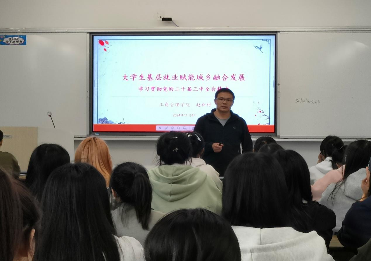 黨的二十屆三中全會明確提出要完善就業(yè)優(yōu)先政策,特別要完善高校畢業(yè)生、農(nóng)民工、退役軍人等重點群體就業(yè)支持體系,著力解決結(jié)構(gòu)性就業(yè)矛盾。2024年11月4日,工商管理學(xué)院開展大學(xué)生基層就業(yè)賦能城鄉(xiāng)融合發(fā)展主題黨課,工商管理學(xué)院黨總支副書記趙新村授課,學(xué)生黨支部60余名學(xué)生黨員參加。